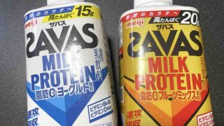 サバス2種類を買ってきて飲み比べてみたSAVAS MILK PROTEIN 15g & 20g左の15gはヨーグルト風味=159円右の20gはフルーツミックス風味=200円どちらもすごく美味しい20gフルーツミックス風味はヨーグルトにリンゴ...