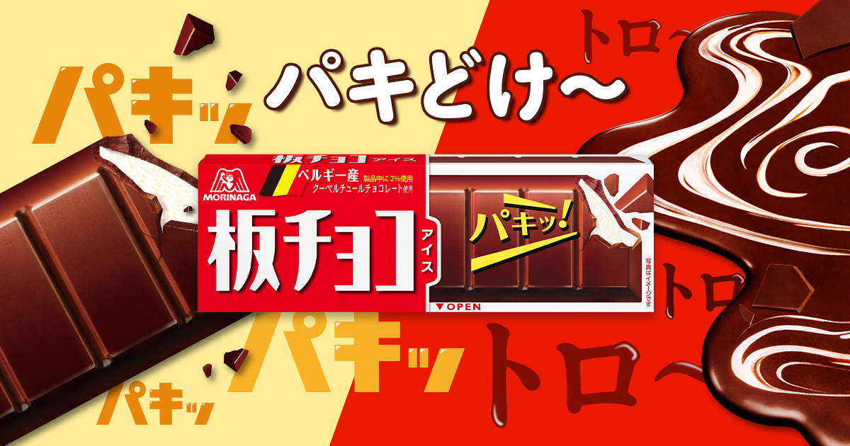 チョコが主役の板チョコアイス。板チョコのパキッとした食感と、バニラアイスのなめらかな口どけがおいしい新品質のアイスです。