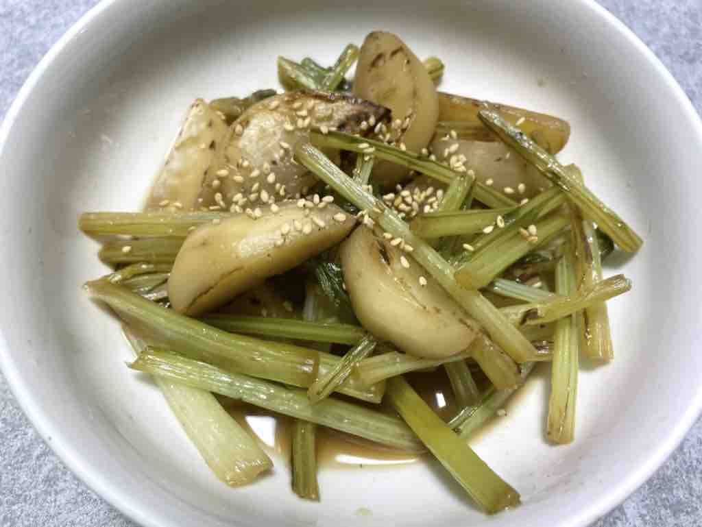 表面の色が変わったら、葉の部分を軸から順番に加えて炒める