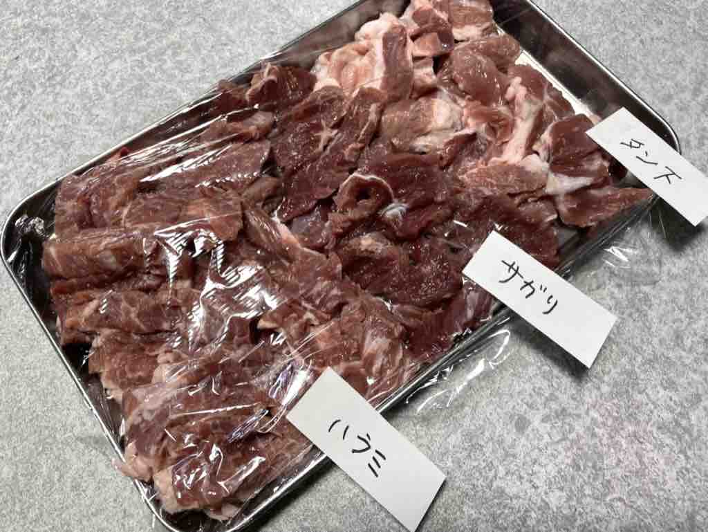 専門店で買ってきた豚モツを丁寧に捌いて?バットに並べる