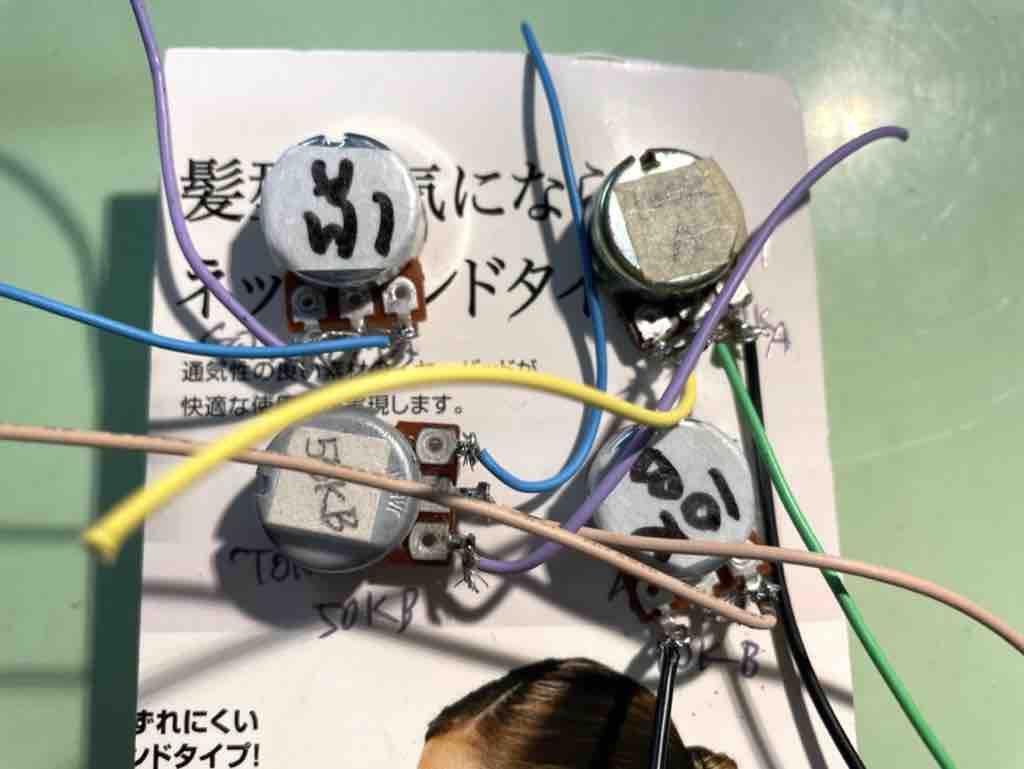ボリュームポットを厚紙に固定して配線材をハンダ付け