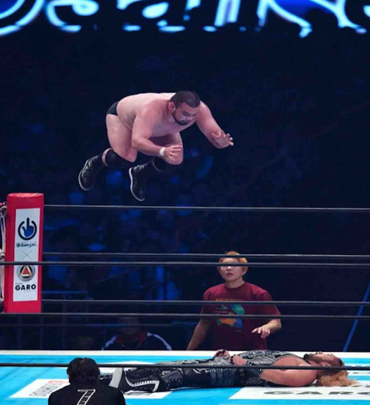 最上段から棚橋選手に習ったであろうハイフライフロー!