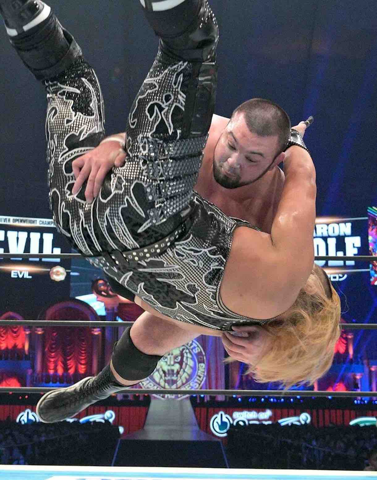 最後は柔道技の逆三角絞めで失神させ、レフェリーストップ!